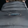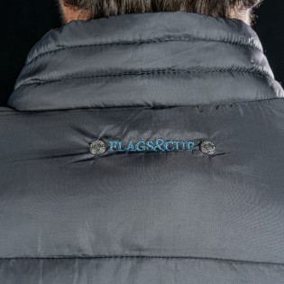Ecusson épaule gauche en métal sur empiècement en cuir synthétique contrasté cousu.