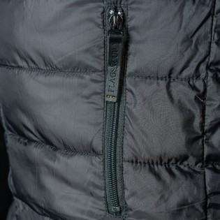 Fermeture frontale zip, avec passepoil intérieur à rayures contrastées.