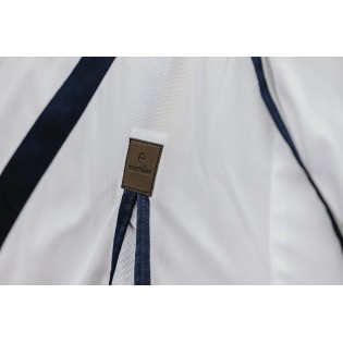 Un patch en faux cuir sur la première fermeture indique la taille de la chemise et un passepoil argenté rehausse son liseré marine en bordure.