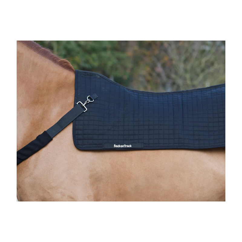 Le Chauffe Dos Royal est doté de la technologie Welltex® ce qui peut apporter un confort au dos endolori et fatigué, aux tensions musculaires, au dos froid, etc., pour garder les muscles chauds et souples, ce qui, à son tour, augmente le bien-être de vos chevaux. En raison de son emplacement, il couvre de manière optimale l'ensemble des muscles du dos, les lombaires et les reins. Deux anneaux d'attache permettent de fixer le collier du Back Warmer (vendu séparément) et d'un cordon de queue.