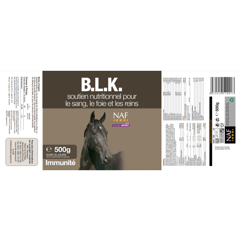 Formulé pour le soutien nutritionnel du sang, du foie et des reins qui sont les nettoyeurs et draineurs de l’organisme. À certains moments de mise à l’épreuve extrême, le foie et les reins peuvent montrer des signes de stress, ce qui se traduit souvent par des profils sanguins pauvres. En ciblant ces organes avec un soutien spécifique à base de plantes, telles que le chardon-Marie et le pissenlit, nous pouvons améliorer l'alimentation du cheval et permettre leur bon fonctionnement. BLK comprend également des antioxydants, scientifiquement vérifiés et de source naturelle, pour drainer l'accumulation de radicaux libres au sein de l’organisme.